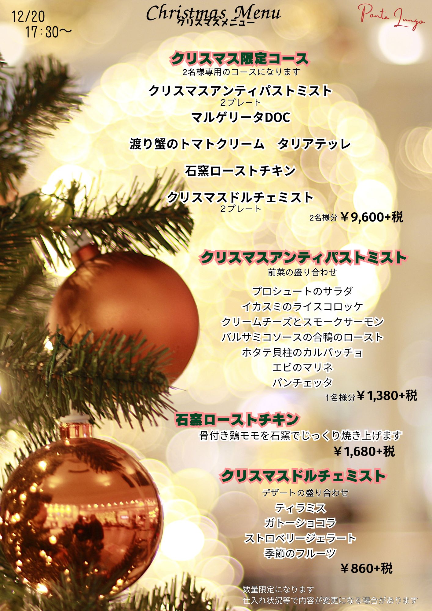ランチ 11:30~13:30 LO / ディナー 17:30~21:30 20:30ラストオーダー |